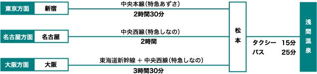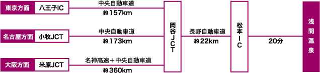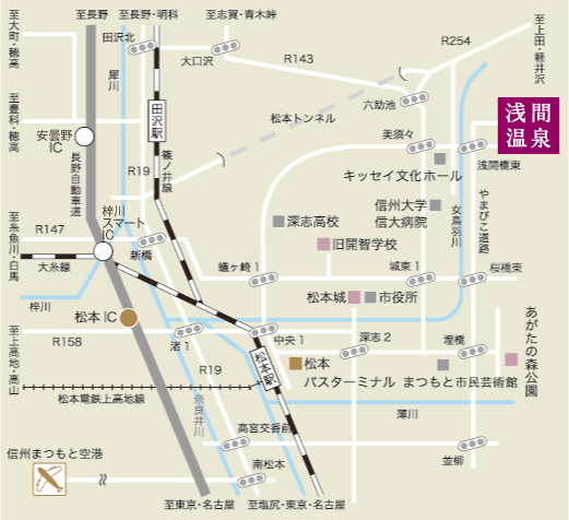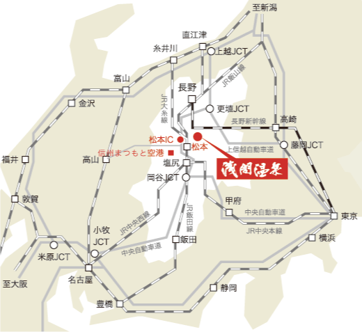 アクセス情報 – アクセスマップ 広域アクセスマップ NEXCO中日本 ※松本ICの北にある梓川スマートインターをご利用頂くと、松本トンネル(100円)経由で、約10分で浅間温泉にお越し頂けます。 JR東日本 信州まつもと空港 駅・ICからのアクセス アルピコ交通