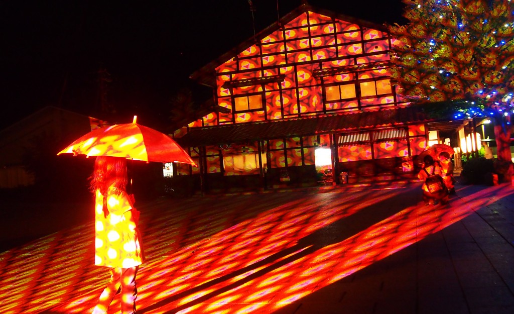 プロジェクションマッピング(デジタルアート)の場所を、温泉施設「ホットプラザ浅間」の建物の広場側正面に変更し、プログラムも1日目と変えてよりはっきり投影されるようになりました。