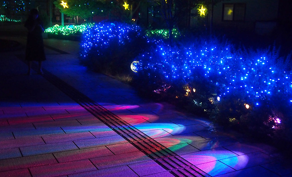 今年は一部部材を新しくし、ホットプラザ前の庭のイルミネーションに、白鳥の下にお堀の水をイメージして青色のライティングをしています。