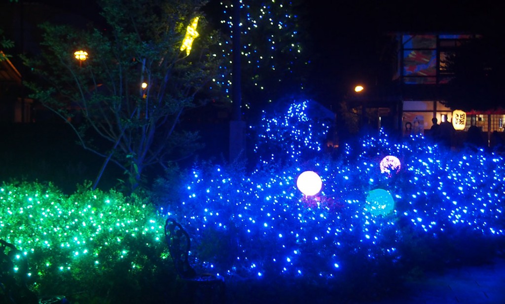 夏のイルミネーションは、樹木に葉っぱがあるので、冬に行っているイルミネーションとはひと味違います。また、イルミネーションは洋風のイメージですが、珍しいエメラルドグリーンやシャンパンブルーの光が、和風の温泉施設にもしっとりとマッチして情緒があります。5色に彩られた歩道の部分は、子供さん達が不思議がって喜ばれています。