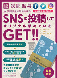 キャンペーンの一環として、浅間温泉の旅館の館内や料理の写真をFacebook・Twitter・Instagram等のSNSでハッシュタグ #asamaonsen を付けて投稿し、それをお見せ頂くと、オリジナル手ぬぐいもプレゼント中です。
