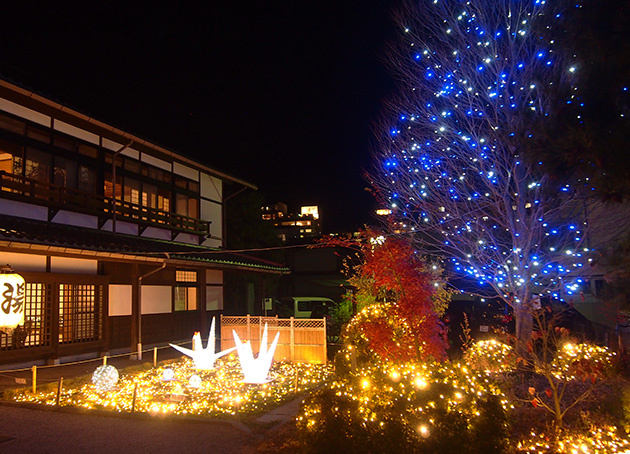 カツラの大木2本の星のように瞬くイルミネーションと、松本城をモチーフにした他では見られない和風のイルミネーションです。