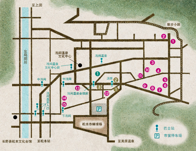 交通・地图 – 浅间温泉的地图 旅馆 1 御座之汤 9 尾上之汤旅馆 2 坂本之汤旅馆 10 富士乃汤 3 万年青(Omoto)酒店 11 FAN!松本 4 静保庵 小柳酒店 12 静保庵 小柳酒店 5 仙聚楼 荣之汤 13 归乡亭 汤本屋 6 雏之汤 14 菊之汤 7 香兰荘 15 东石川旅馆 8 梅之汤 纯泡汤 1 浅间温泉会馆 商店 1 宫岛商店 2 美月堂 宫田名产店 3 Atelier MOO 谷歌地图PDF 地图 (英语)