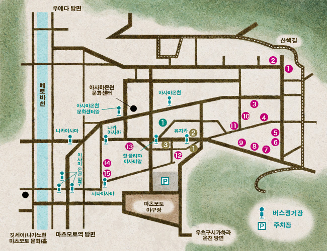 찾아오시는 길・지도 – 아사마온천 내 지도 료칸 1 고자노유 9 오노우에노유 2 사카모토노유 10 후지노유 3 호텔 오모토 11 호스텔&스파 팬!마츠모토 4 호텔 고야나기 12 메노유 5 사카에노유 13 유모토야 6 히나노유 14 기쿠노유 7 고란소 15 히가시 이시카와 8 우매노유 공중욕탕 1 핫 플라자 아사마 토산품점 1 미야지마 상점 2 미게츠도 – 미야타 명산점 3 아틀리에MOO 구글 지도PDF 지도