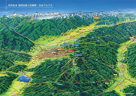 浅間温泉と松本市街地を中心に、安曇野・日本アルプス・安曇野・美ヶ原高原・上田・諏訪・長野市などの位置関係が一目で分かる鳥瞰図です。「松本平」は松本盆地のことを表す地元の言葉です。