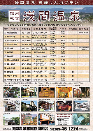 浅間温泉で立ち寄り入浴のできる宿のリストです。 ①飯田屋別館・⑫ホテル井筒は、現在営業しておりません。③ホテルおもと(現onsen hotel OMOTO)・④ホテル小柳(現松本十帖)は、現在立ち寄り入浴はやっておりません。②坂本の湯は旅館の営業はしていませんが、立ち寄り湯としては営業されています。立ち寄り入浴のできる宿のリスト(1ページ 700KB)