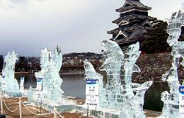 長野県内外から十数組の氷彫刻家の職人たちが、寒い中、夜を徹して氷で彫刻を制作して腕を競います。制作された氷の彫刻は、松本城をバックに屋外で展示され、人々を魅了します。