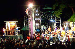 松本城の公園や市街地で、プロ・アマを問わず全国から集まった演奏団体が、日本の伝統芸能「和太鼓」を演奏します。夕闇に浮かび上がる松本城のシルエットが、和太鼓や尺八などの演奏とぴったり合って、目も楽しめます。外国人にも人気で、海外から太鼓まつりを目当てに来る人もいます。