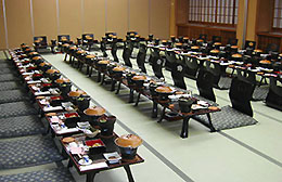 ドラマなどでも見られる大広間の畳でお膳を並べての昔ながらの披露宴も、イス・テーブルの会場での披露宴にも対応いたします。